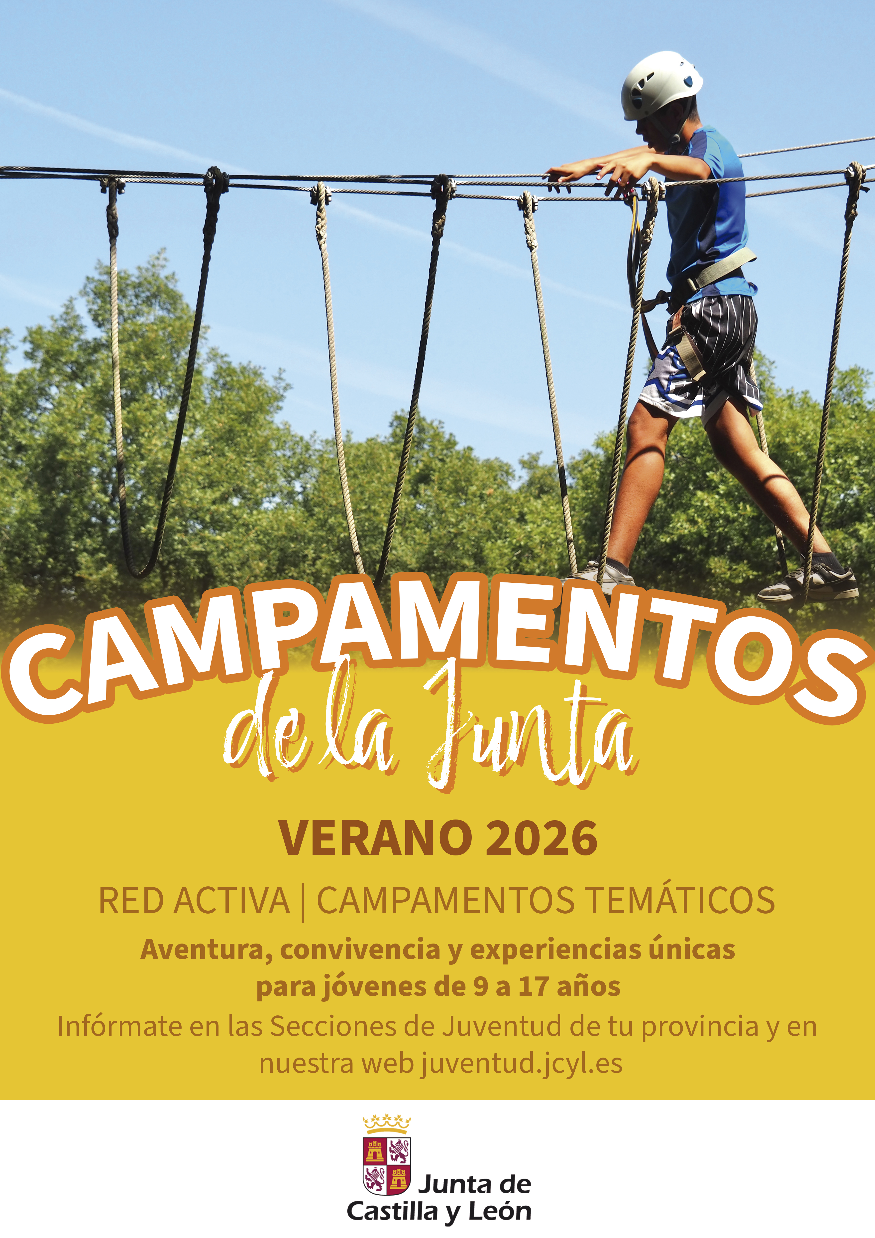 El 20 de marzo de 2026, se han publicado en el Boletín Oficial de Castilla y León las Órdenes FAM 265 y 266 de 16 de marzo de 2026, de la Consejería de Familia e Igualdad de Oportunidades, por la que se convocan los Programas «Campamentos de Verano Red Activa 2026» y «Campamentos Temáticos Juveniles 2026». Se adjunta cartel y hojas informativas Para más información en los siguientes enlaces: